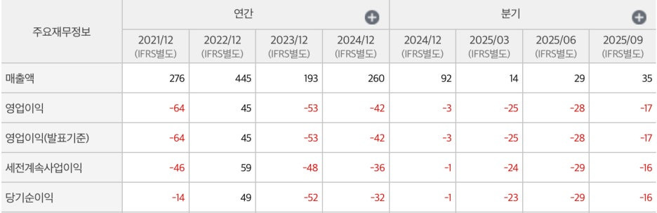 * 2025년 3분기 누적: 별도 기준 매출액이 전년 동기 대비 약 50% 이상 감소했으며, 영업손실 폭이 확대되었습니다.