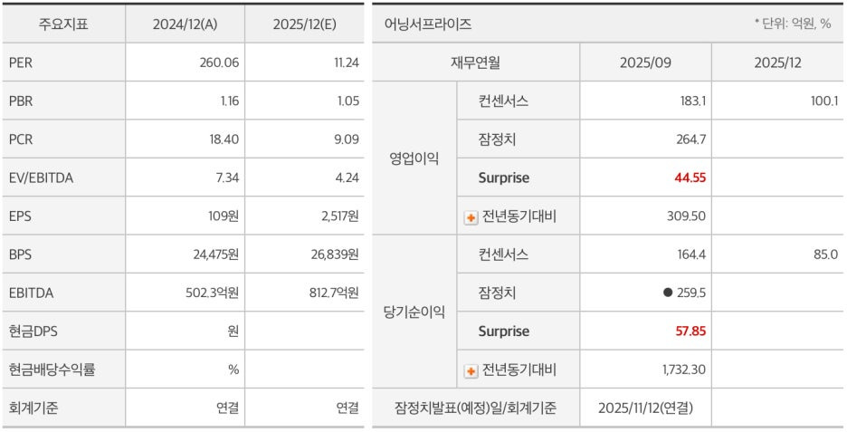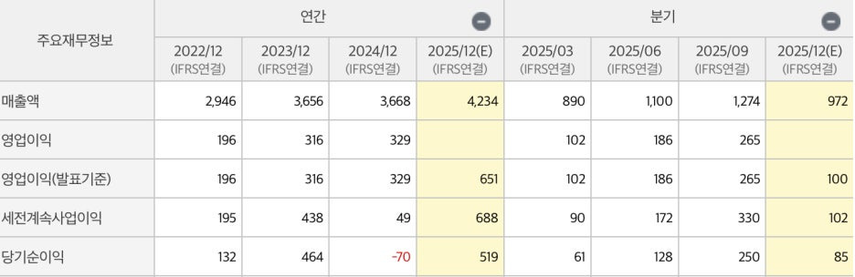 * 2025년 - 수익성 극대화: 3분기 어닝 서프라이즈: 2025년 3분기 매출 1,274억 원, 영업이익 265억 원을 기록하며 전년 동기 대비 영업이익이 309.5%나 폭증했습니다.