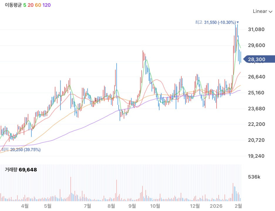 * 눌림목 형성: 최근 31,000원대 고점 대비 약 7~10% 하락하며 20일 이동평균선(약 27,000원~28,000원 부근) 근처까지 내려왔습니다. 이 구간에서 반등이 나온다면 건강한 조정(눌림목)으로 볼 수 있습니다.